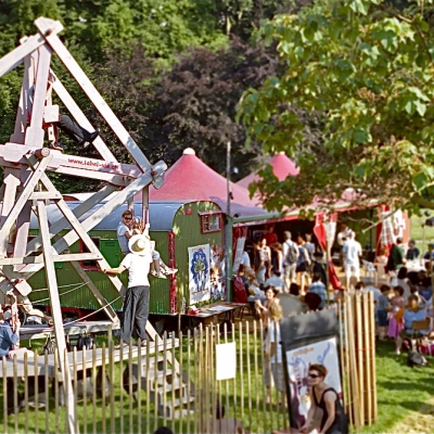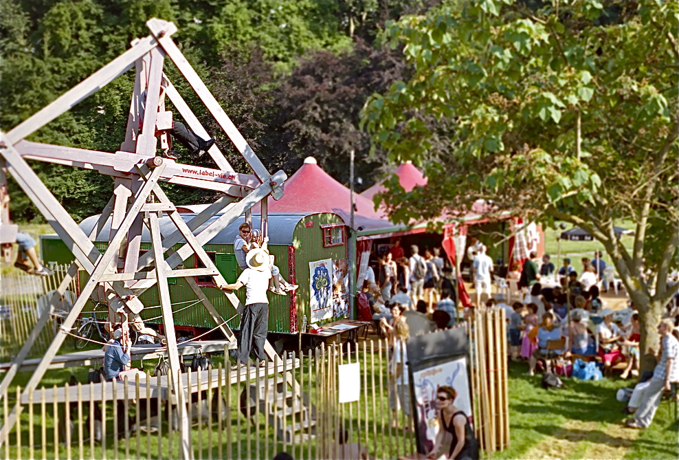 L’été 2010 la Grande Roue népalaise est installée au parc de la Grange à côté de la Tour Vagabonde où le théâtre de l’Orangerie fait sa saison (pendant les travaux de rénovation de sa salle). C’est une version améliorée qui est expérimentée pendant ces deux mois: plateformes pour les tourneurs de la Roue, petite cordelettes sur les sièges… on commence à adapter la sécurité aux normes locales, …en douceur! mais la Petite et la Grande Roue sont assurées par la Vaudoise. Nous les remercions de nous avoir fait confiance: 5 ans après ces premiers pas et après un nombre impressionnant de tours de Roues: nous n’avons connu aucun accident. Nous avons considérablement sécurisé nos modèles et continuons, année après année d’apporter des améliorations sans perdre l’esprit de notre modèle d’origine!